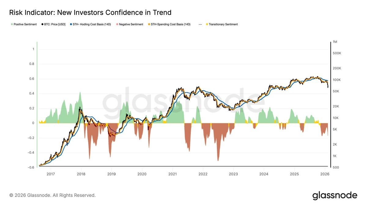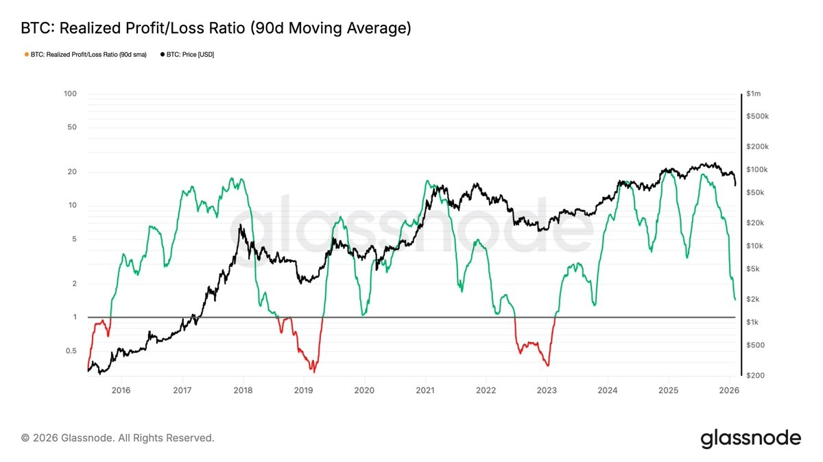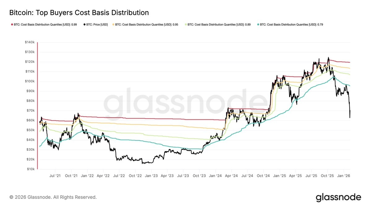 Od ATH w październiku 2025 roku cena nie przekroczyła górnych benchmarków kosztów na poziomie 1%, 5%, 10% i 20%. Przy 60000 dolarach cena była o ~37% niższa niż koszt bazowy na poziomie 20% (~95000 dolarów), co pokazuje ogromną presję psychologiczną na głównych nabywcach, co jest porównywalne z sytuacją z maja 2022 roku.