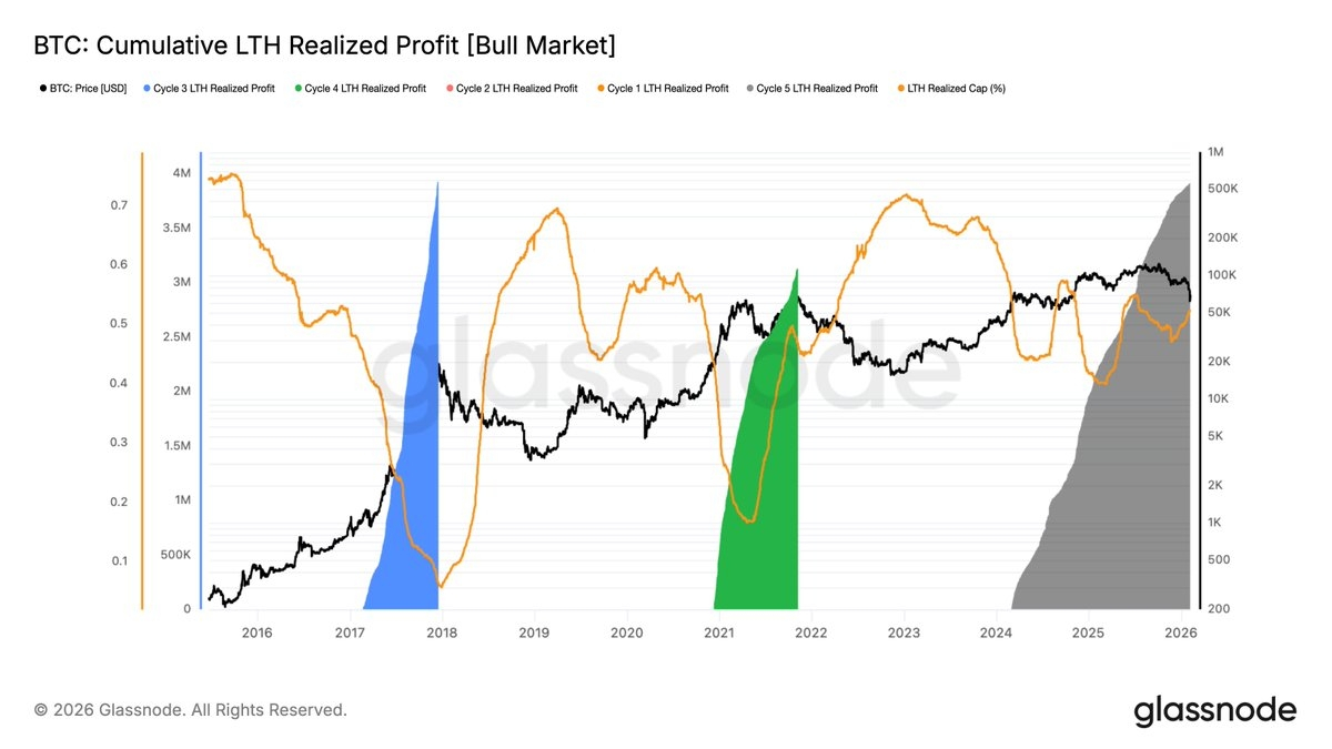 Ten wskaźnik obserwuje skumulowane zyski, które długoterminowi posiadacze zrealizowali od ATH w każdym cyklu do ostatecznego szczytu, od 11 października LTHs dodatkowo zrealizowali około 318000 BTC zysku, co jest niezwykle dużym wskaźnikiem, więc w miarę osłabienia rynku, ta część zrealizowanych zysków będzie wywierać ciągłą presję w dół na rynek. Z danych wynika, że presja w dół w listopadzie i grudniu 2025 roku stale rośnie, jednak od początku grudnia wzrost LSH zwolnił, co wskazuje, że tempo realizacji zysków LTH zwalnia.