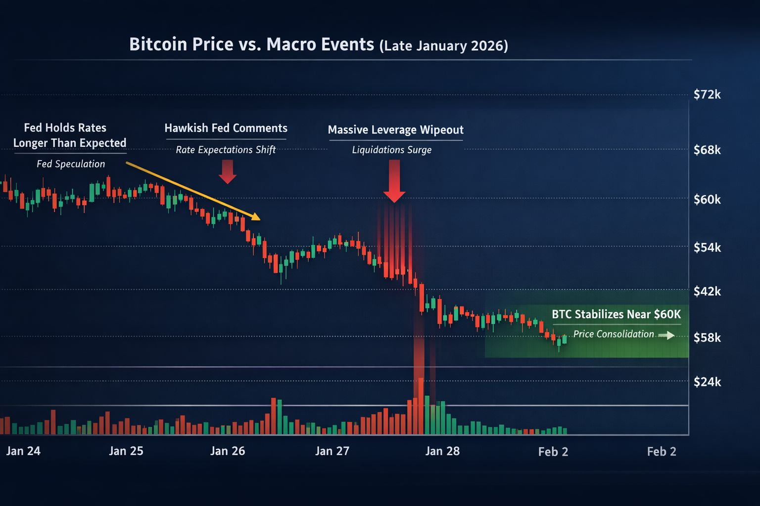 In late January 2026, $BTC experienced a significant correction, sliding from levels near its late-2025 highs toward the $60,000 area before stabilizing. This wasn’t triggered by a problem within the Bitcoin network, instead, it reflected broader macroeconomic forces that shaped risk appetite across global markets.