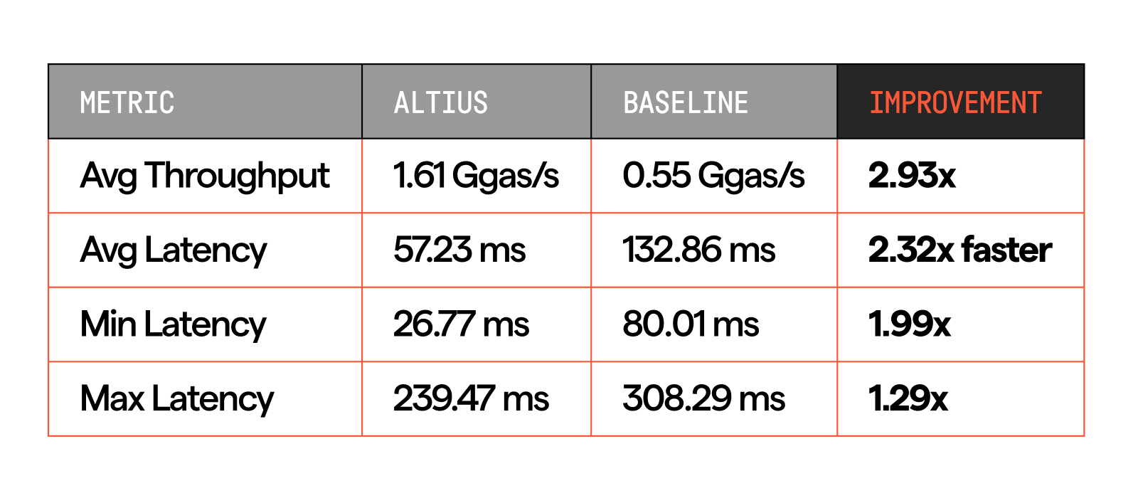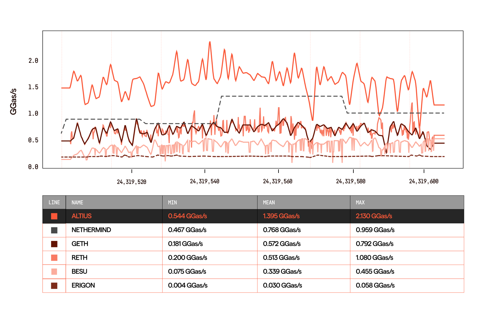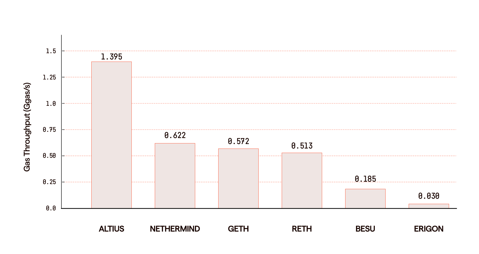 Altius so với Geth trên Ethereum Mainnet: Trong khi Geth vận hành ở mức khoảng 0.572 Ggas mỗi giây, Altius đạt 1.395 Ggas mỗi giây, tương đương mức tăng hiệu năng 2.44 lần so với client được sử dụng rộng rãi nhất. Hiện tại, Altius là client duy nhất vượt qua ngưỡng 1.0 Ggas mỗi giây, mức cần thiết cho giao dịch tần suất cao cấp tổ chức và thanh toán quy mô lớn.