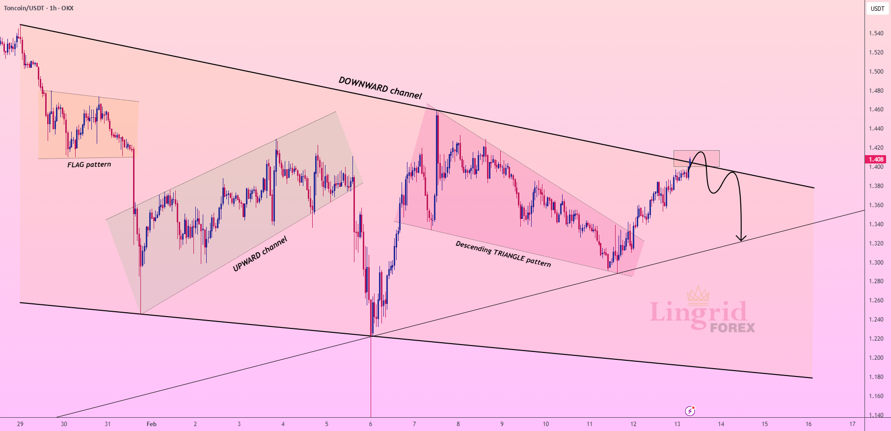 TONUSDT doskonale zrealizował mój poprzedni pomysł inwestycyjny. Cena testuje górną granicę dobrze zdefiniowanego zstępującego kanału, w którym pojawiły się liczne wcześniejsze reakcje. Ostatni wzrost wydaje się być korekcyjny, wspinając się w kierunku konfluencji dynamicznego oporu i poziomu podaży w pobliżu 1,40–1,42. Struktura nadal odzwierciedla sekwencję niższych szczytów na szerszym nachyleniu, co sugeruje, że próby wzrostu mogą być narażone na ryzyko, jeśli sprzedawcy będą bronić tego obszaru.