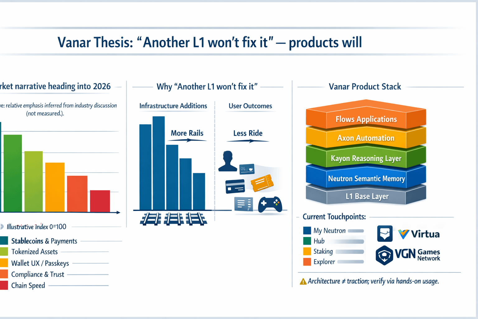 Vanar has been showing up in that conversation with a pointed claim: the work now is products, not more chain theater. Under the hood, it still includes an L1, but it describes a stack that tries to make applications remember and reason as part of the system. On its site and in its documentation, Vanar lays out Neutron as semantic memory, Kayon as an on-chain reasoning layer, Axon as automation, and Flows as the place where industry applications live. I don’t take architectures as proof, but I do like that it names the missing pieces plainly. And when I see the line “not another L1” repeated by its community, I treat it as a promise that can be tested, not a slogan to admire.