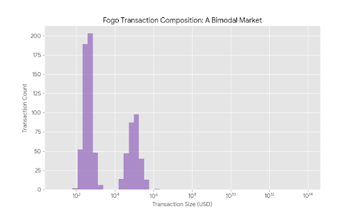 First, transaction sizes are bimodal. There's a cluster of small retail trades under $1,000 and a separate cluster of institutional-sized trades above $50,000. The mid-range is thinner than on other chains. This suggests that Fogo is attracting both ends of the market retail users who value low latency for gaming or small trades, and institutions who value predictability for large moves but not yet the broad middle of crypto traders.