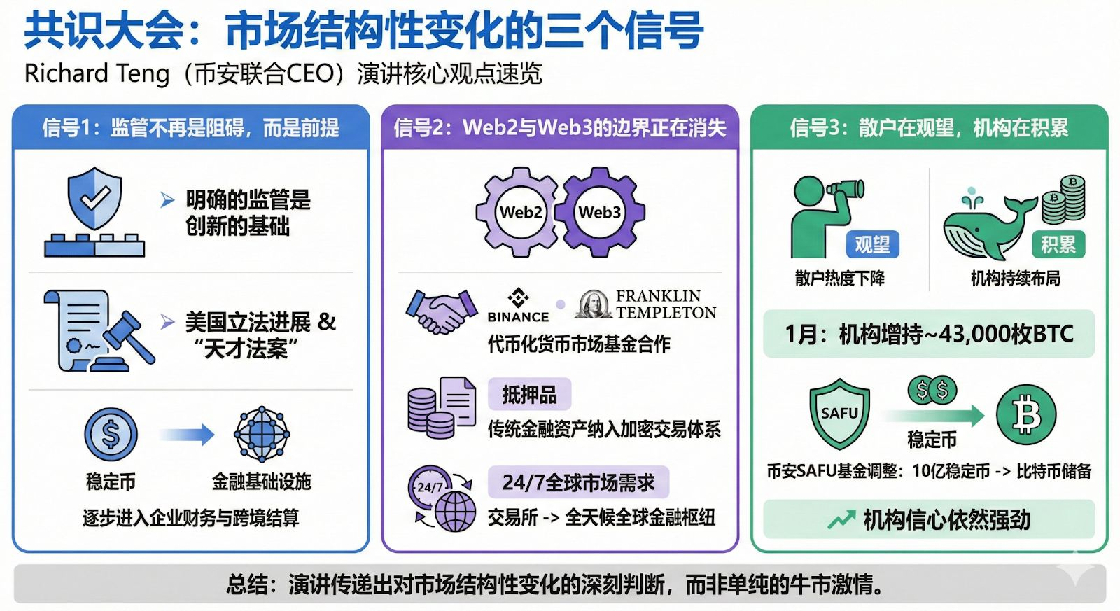 在价格波动、情绪低迷的周期里,此次共识大会的演讲有别于往年牛市时期的激情表达,而更像是在传递一种对市场结构性变化的判断。其中,币安联合首席执行官 Richard Teng 的讲话具有一定代表性,整场演讲可以捕捉到几个非常清晰的信号,关于监管、机构、基础设施。