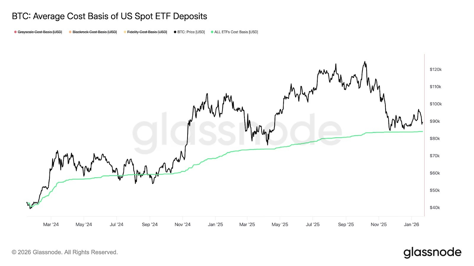 现货ETF吸金火爆: 机构通过现货ETF接入比特币市场成为主流手段,并且ETF数据也是窥探市场热度的手段之一。比如,根据SoSoValue数据显示,美国现货比特币ETF在1月底出现自去年11月以来最大规模单周资金流出(约12.2亿美元),而历史经验显示,大规模赎回往往发生在价格阶段性底部附近,因此当前比特币可能接近局部低点。下图数据表明,ETF投资者的平均持仓成本约为84,099美元,这一价格区间过去多次形成关键支撑位,若历史模式重演,本轮资金外流或意味着短期下跌动能接近尾声,市场存在反弹可能。