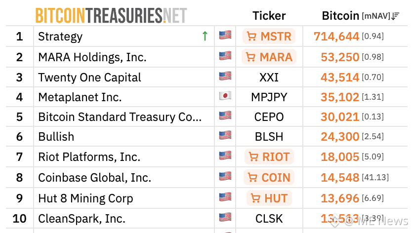 上市公司总体持有激增: 据报道,2025年Q4全球上市公司持有的比特币总量达到约110万枚(约940亿美元),新增19家上市公司购买比特币。这说明比特币正被越来越多企业视为战略资产。除著名的战略金库公司外,多家新上市企业亦加入买盘阵营,进一步验证了机构资本的涌入趋势,下图是排名前10的比特币财库数据。