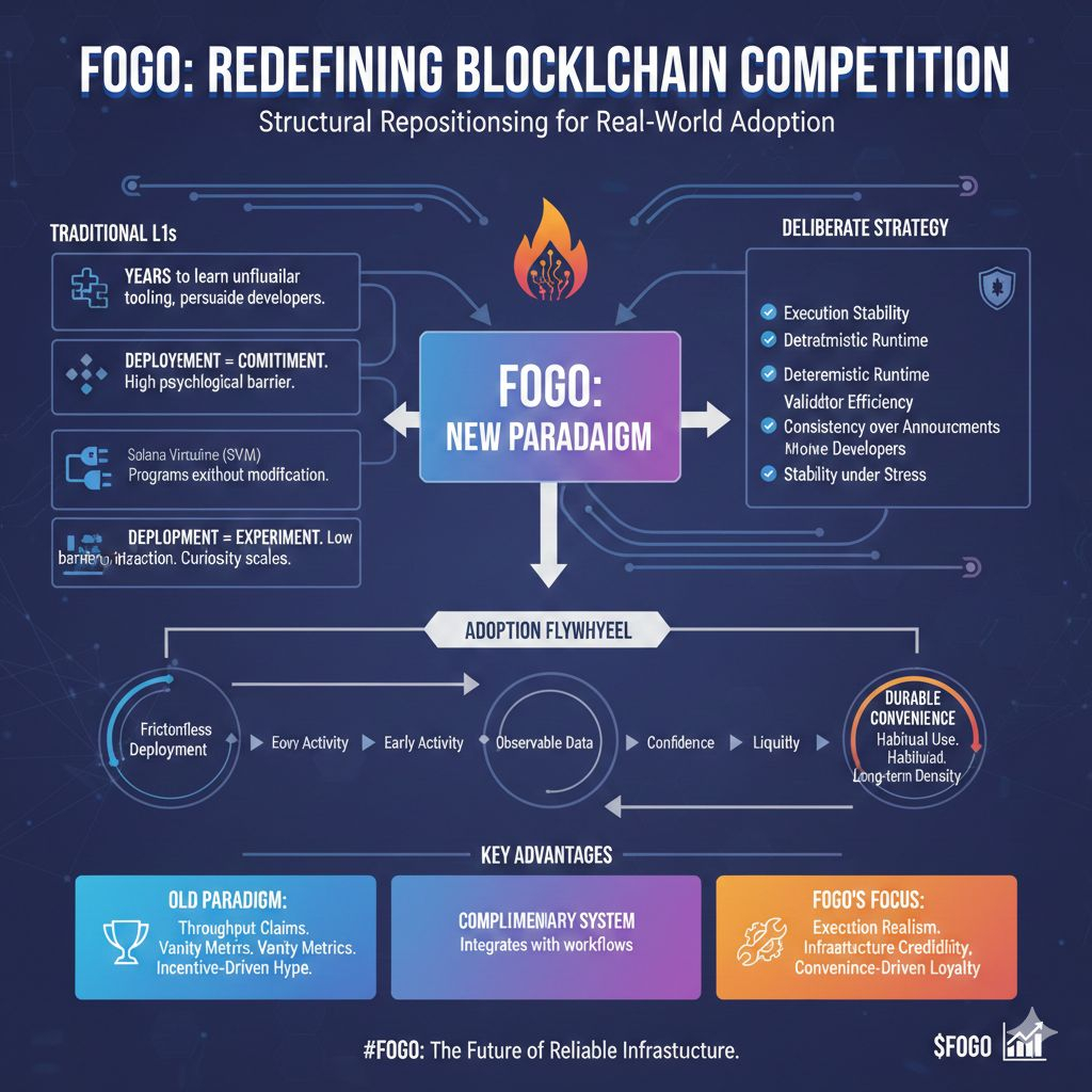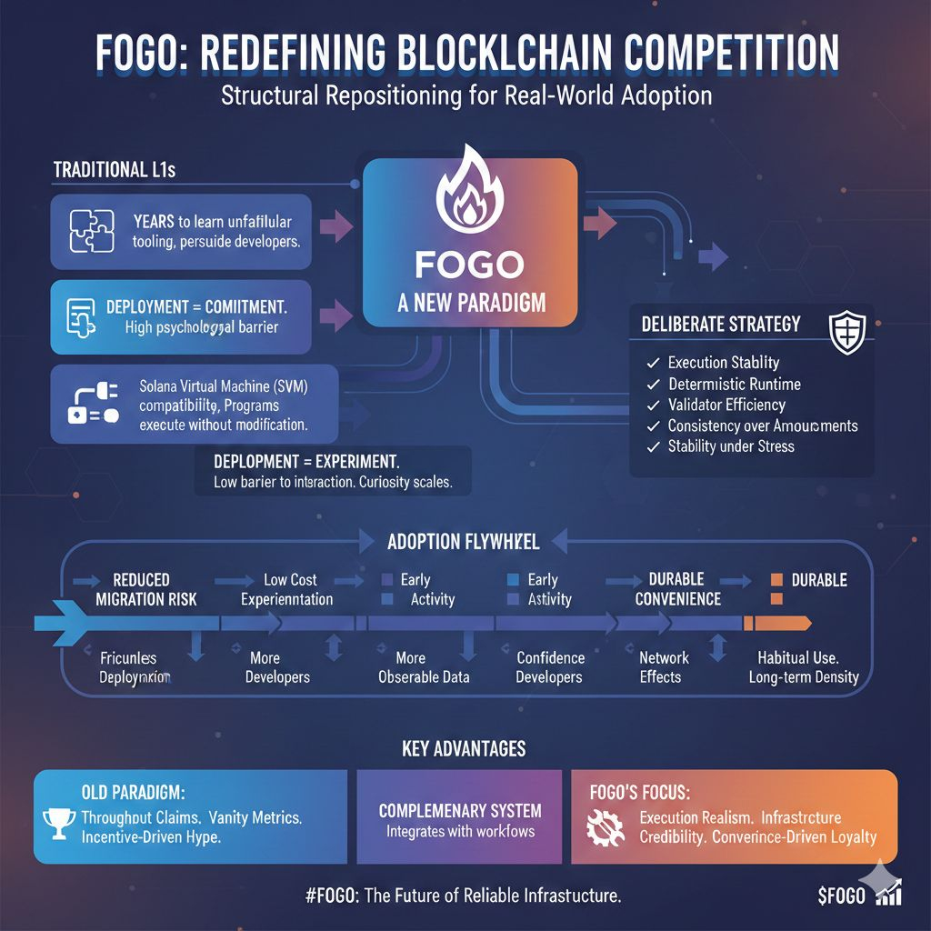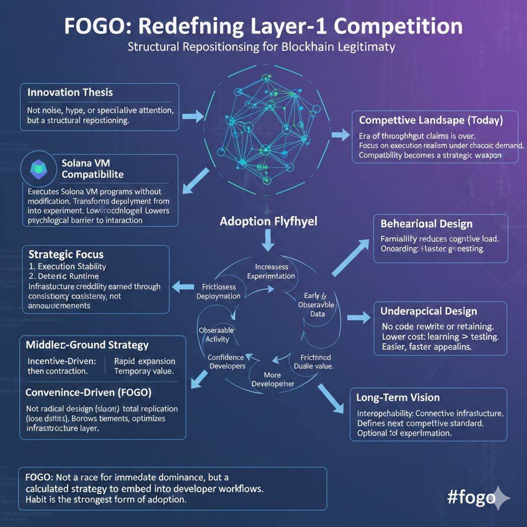 is not noise, hype, or speculative attention, but a structural repositioning that quietly changes how new blockchains compete for legitimacy. Most Layer-1 networks spend years trying to persuade developers to learn unfamiliar tooling before they can even begin building an ecosystem. Fogo reverses that sequence by allowing programs designed for the Solana Virtual Machine to execute without modification. That single architectural decision compresses the adoption timeline because it transforms deployment from a commitment into an experiment. Builders no longer need conviction about long-term success before interacting with the network; they only need curiosity. In technology markets, lowering the psychological barrier to first interaction is often more powerful than increasing incentives, because curiosity scales naturally while incentives must be funded.