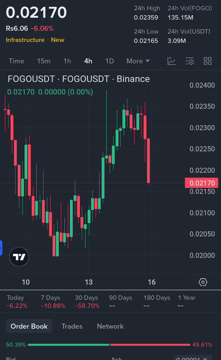 The crypto market never sleeps, and right now FOGO is giving everyone a front-row seat to high drama. Trading on Binance as FOGO/USDT, the token sits around 0.02234 after shedding roughly 4% in the last 24 hours. This isn’t just noise it’s a continuation of real pressure that started after the explosive hype peak.