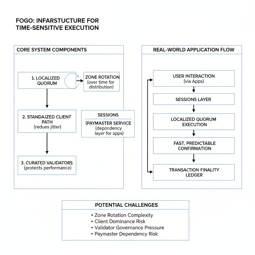 Więc gdy wszystko to zbiorę, nie widzę Fogo próbującego być wszystkim dla wszystkich. Widzę, że próbuje być specyficznym rodzajem łańcucha: takim, który zachowuje się bardziej jak infrastruktura dla czasowo wrażliwego wykonania, a mniej jak eksperyment ogólnopojęciowy, w którym nieprzewidywalność jest usprawiedliwiona jako efekt uboczny otwartości. Model jest spójny: lokalizuj kworum dla prędkości, rotuj je w czasie dla szerszej dystrybucji, standaryzuj ścieżkę klienta, aby zredukować szumy, kuruj walidatorów, aby chronić wydajność, a następnie wygładź interakcję użytkowników za pomocą Sesji, aby aplikacje mogły zachowywać się bardziej jak produkty, a nie rytuały.