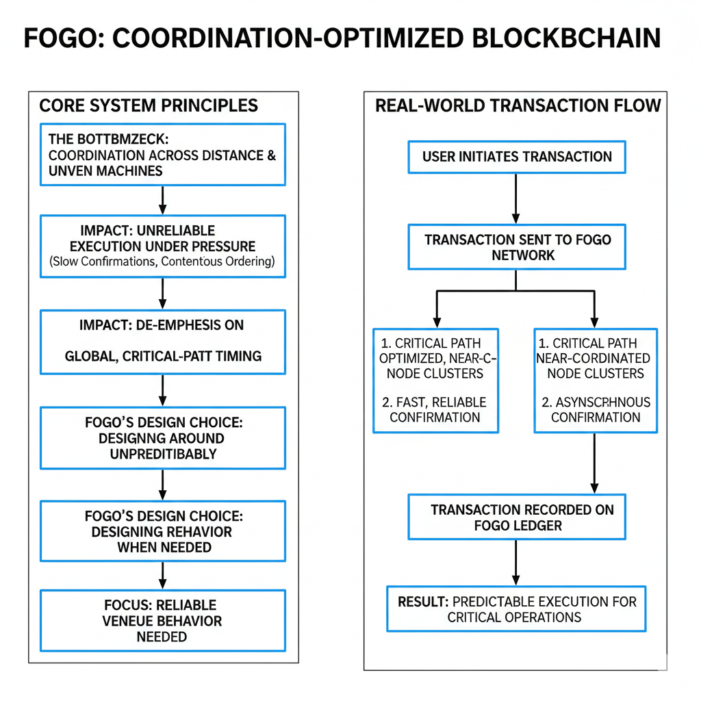 Kiedy patrzę na Fogo, pierwszą rzeczą, którą zauważam, jest to, jak mało stara się wygrać w zwykłych argumentach kryptograficznych. Nie opiera się na niejasnych obietnicach ani szerokich rozmowach o "ekosystemie". Skupia się wąsko na jednym niewygodnym pytaniu: dlaczego blockchainy wydają się niepewne w dokładnym momencie, gdy potrzebujesz, aby zachowywały się jak miejsce? Nie "dlaczego są wolne w średniej", ale dlaczego wykonanie staje się chaotyczne pod presją—dlaczego czas potwierdzenia się wydłuża, dlaczego kolejność staje się kontrowersyjna, dlaczego system zaczyna zachowywać się tak, jakby negocjował sam ze sobą zamiast się ustalać.