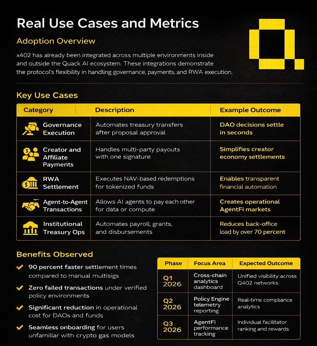 Melalui dokumen Real Use Cases and Metrics terbaru, x402 mengungkap bagaimana infrastrukturnya digunakan secara aktif untuk memecahkan masalah nyata dalam Decentralized Finance (DeFi), mulai dari eksekusi treasury hingga integrasi dengan kecerdasan buatan (AI) seperti $Q
