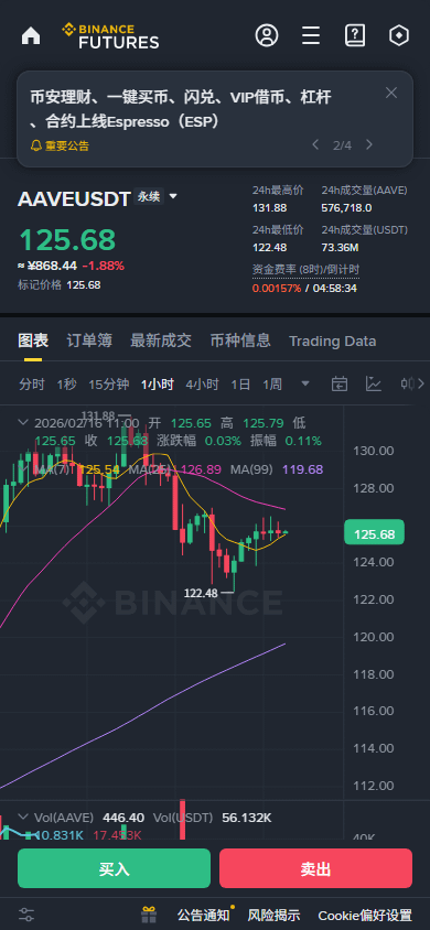 $AAVE 1H级别在EMA20(126.02)下方窄幅震荡,价格被压缩在125.6-126.5的微小区间内,成交量极度萎缩,这是典型的变盘前兆。4H级别仍处于下降通道内的反弹修正,但EMA50(124.74)提供了强劲支撑。当前盘面多空力量暂时平衡,需要一根放量K线来打破僵局。