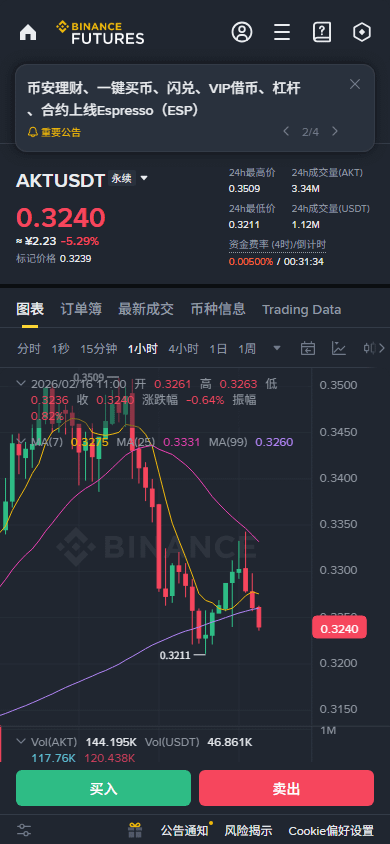 $AKT 1H级别处于下跌通道内的弱势震荡,价格在0.3246附近徘徊,已跌破1H EMA20/50均线。4H级别连续收阴,趋势偏空,但当前1H RSI(36.76)已进入超卖区域,且最新4H K线买盘比例回升至0.60,存在技术性反弹需求。OI稳定,非恐慌性出货,重点狙击反弹或破位后的顺势机会。