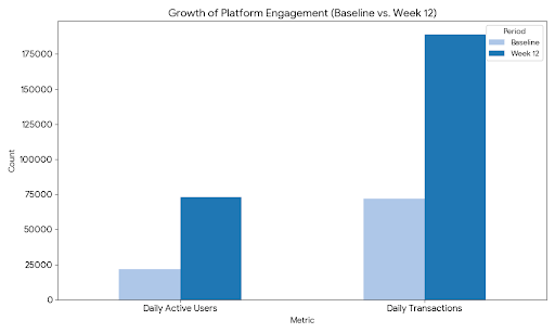The campaign funnel recorded 8.4 million impressions, 612,000 sign-ups, 498,000 verified wallets, and 251,000 active users. This equals a 41% conversion from verified users to active participants, reflecting reduced onboarding friction through simplified registration and familiar brand entry points. A comparison of activity before and during the campaign shows transaction volume increased by 162%, with average user activity also rising, indicating sustained engagement rather than one-time participation.