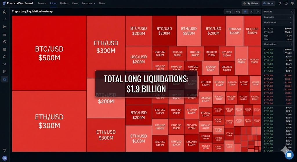 Likwidacja dźwigni: Ponad $1.9 miliarda w długich pozycjach zostało zlikwidowanych w ciągu ostatniego tygodnia. To jest główny powód ostrego spadku - klasyczny efekt domina.