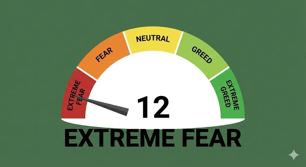 Ekstremalny strach (Indeks na poziomie 12) historycznie pojawia się w pobliżu lokalnych minimów rynkowych.