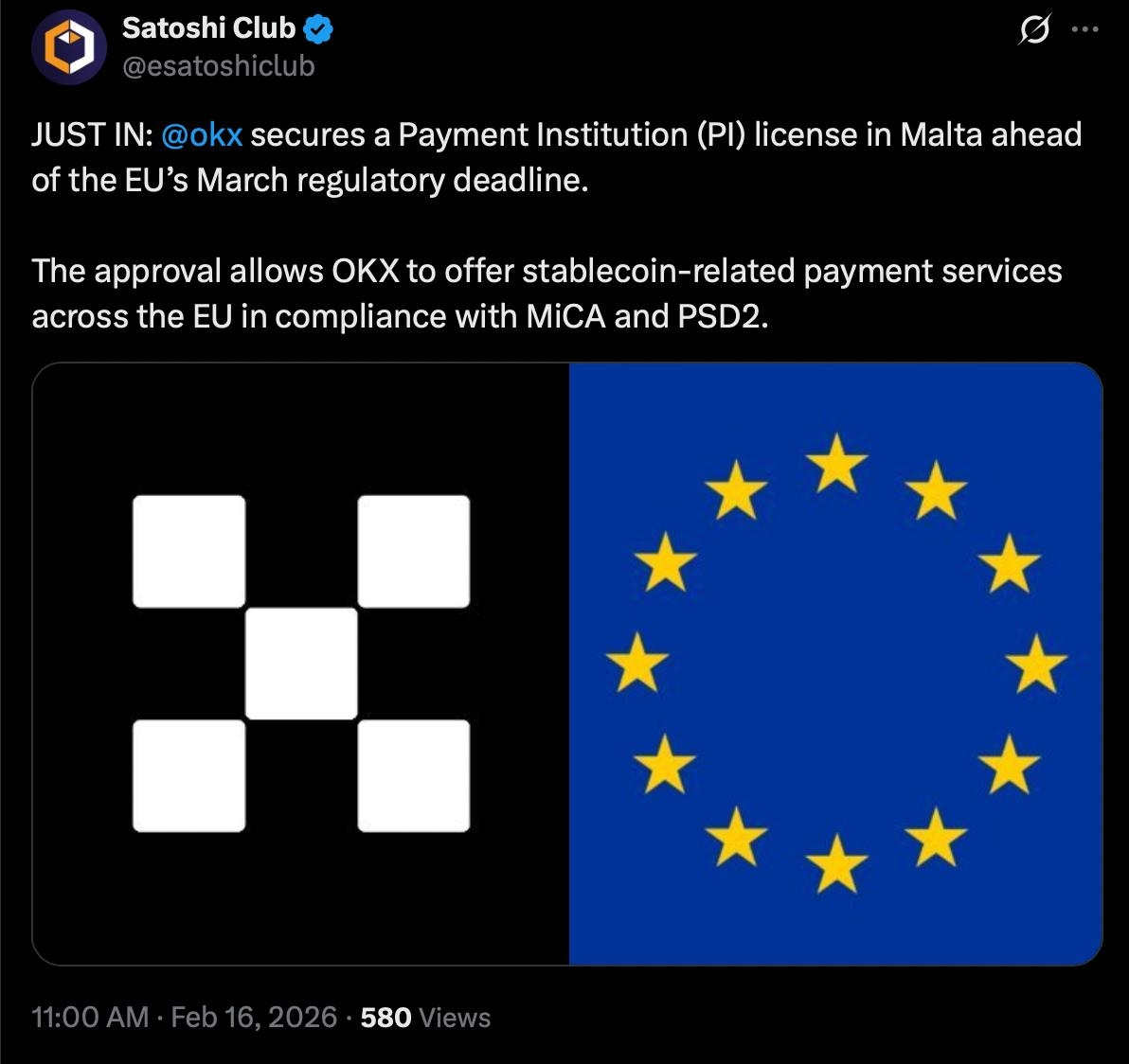 Crypto exchange OKX has obtained a Payment Institution (PI) license from the Malta Financial Services Authority (MFSA), strengthening its regulatory footprint in the European Union as stablecoin rules tighten under the Markets in Crypto-Assets (MiCA) framework.