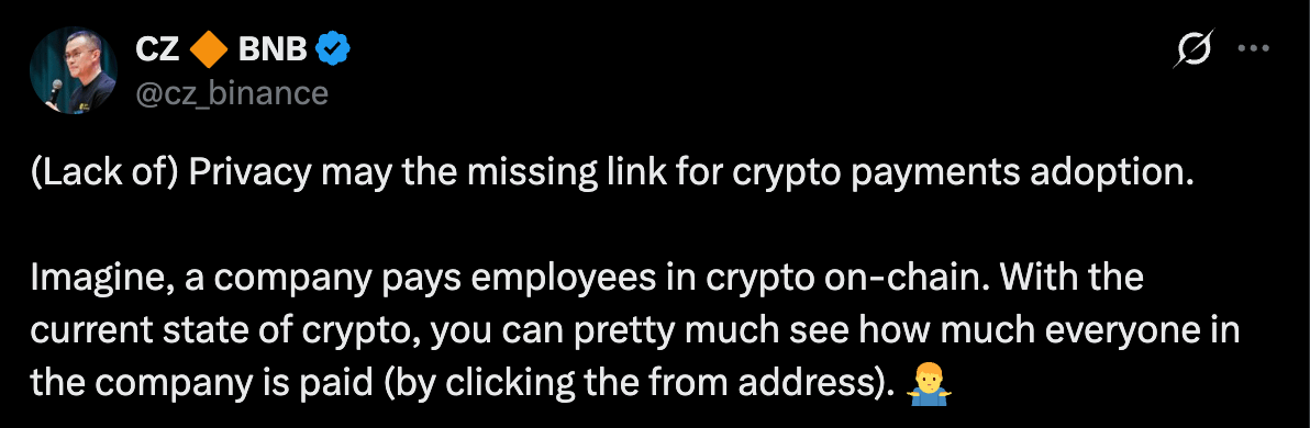 „Brak prywatności może być brakującym ogniwem w adopcji płatności kryptograficznych. Wyobraź sobie, że firma płaci pracownikom w kryptowalutach na łańcuchu. Przy obecnym stanie kryptowalut, możesz praktycznie zobaczyć, ile każdy w firmie zarabia, klikając adres 'od'.”