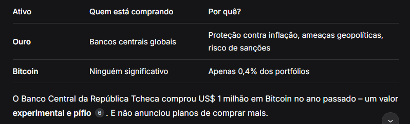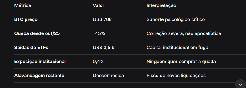 Rejeição institucional disfarçada: O pior de todos os mundos. O setor perdeu a "rebeldia cool" sem ganhar a aceitação do "sistema sério". A pesquisa do Bank of America mostra a verdade: 0,4% de exposição em portfólios institucionais . Ninguém quer.