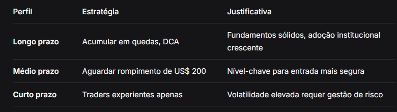 Segundo a mesma fonte, a faixa próxima aos US$ 200 é frequentemente interpretada como um nível-chave para a SOL, sinalizando retomada técnica consistente e reativação do interesse institucional .