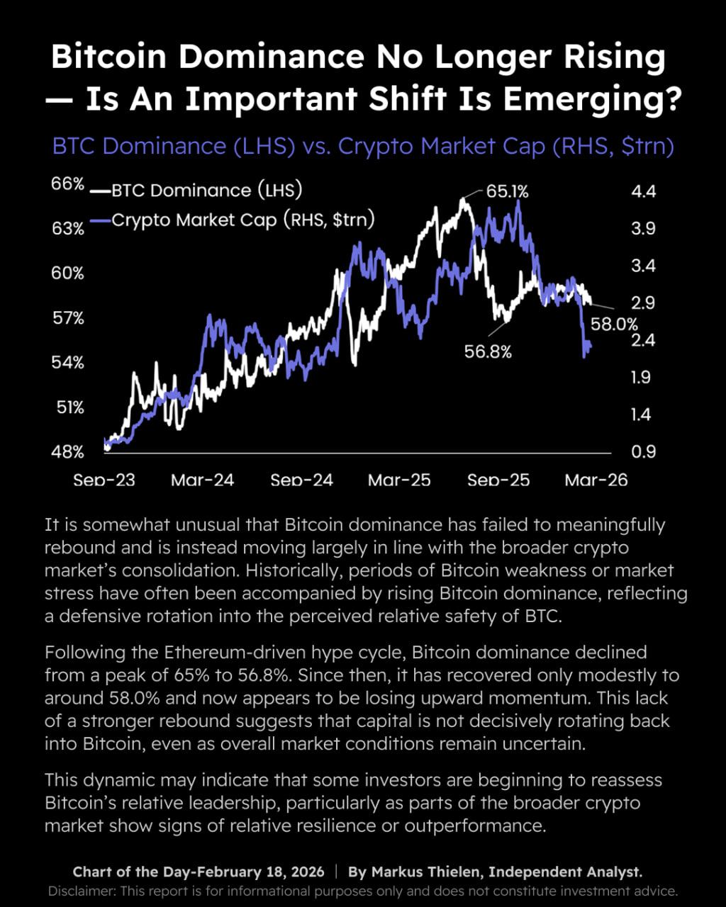 Matrixport: Dominacja BTC przestała rosnąć, co jest nietypowe dla stresującego rynku. Analitycy zadają sobie pytanie: "czy formuje się ważna zmiana?".