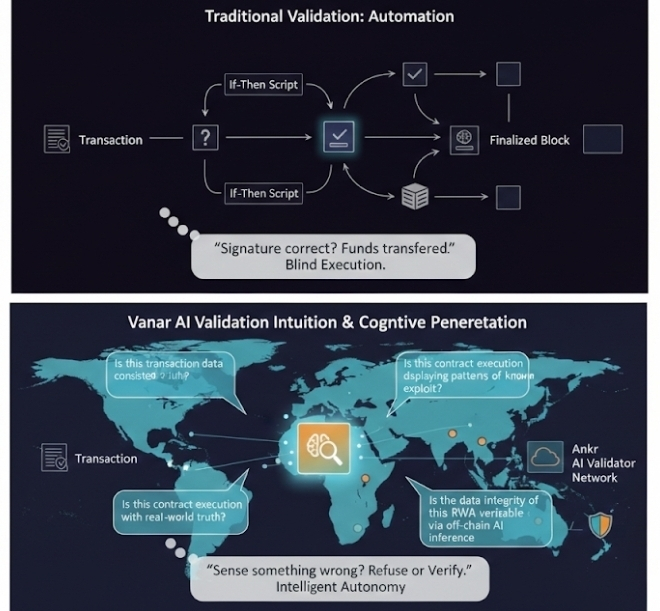 But today, looking at Vanar Chain and its recent integration of Ankr as its first AI Validator, I realized the era of the "clueless contract" is ending.
