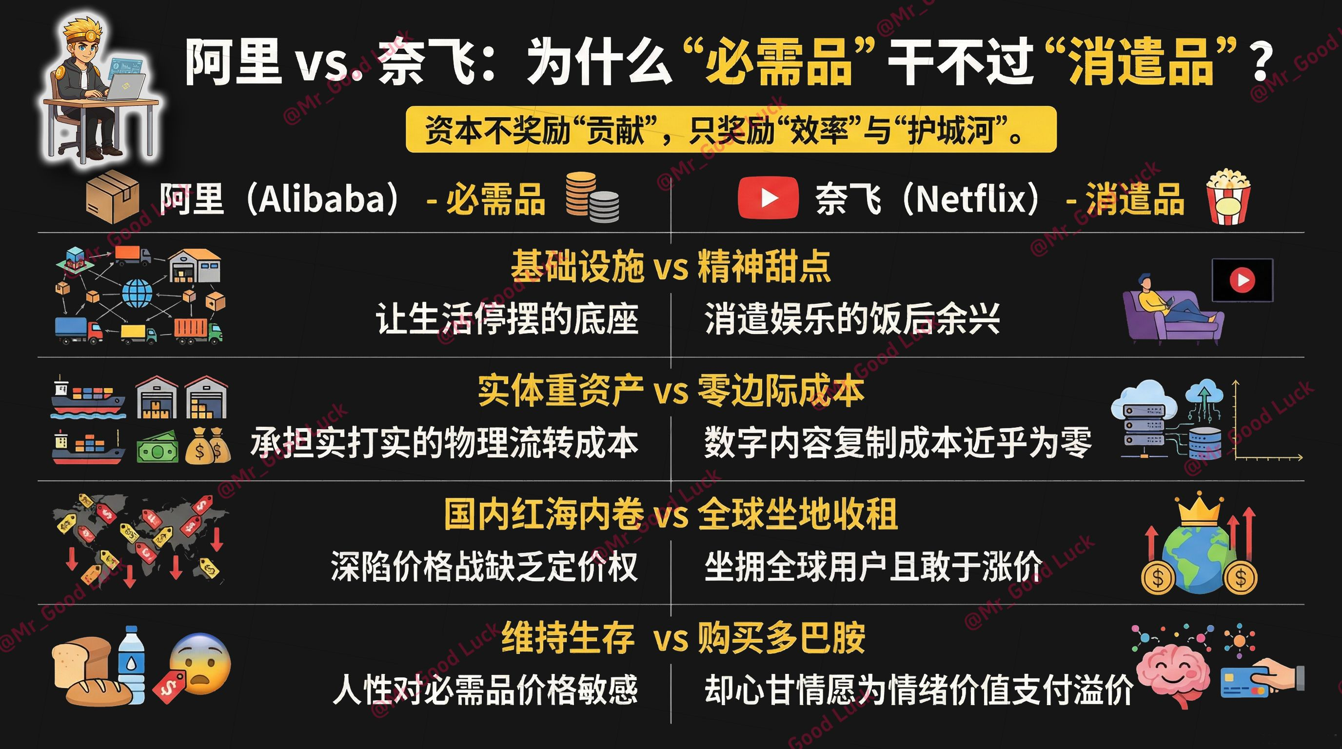 所以,资本市场是很精明甚至很冷血的。它不奖励你对社会的绝对贡献有多大,它只看你赚钱的效率有多高、护城河有多深。阿里稳住了我们生活的底盘,但在资本眼里,奈飞这种能带给全球用户持续多巴胺分泌的机器,显然是个更容易拿高分的性感故事。