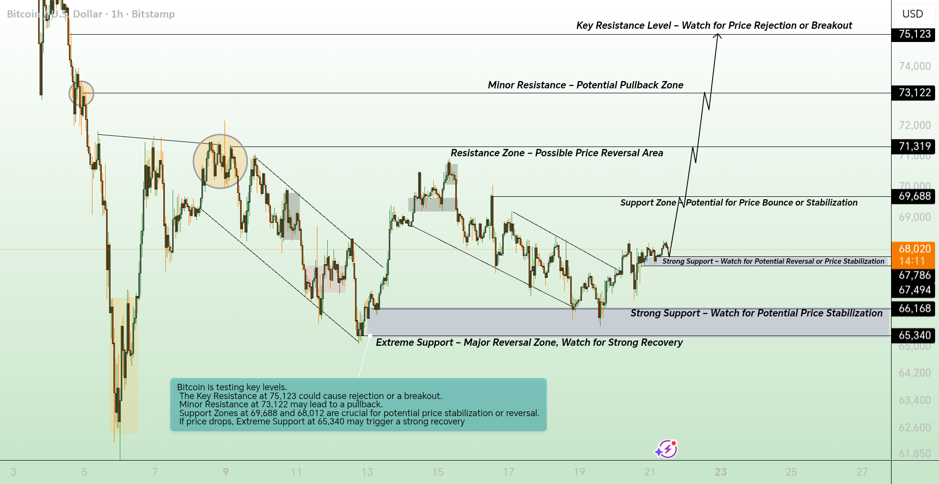Mniejszy Opór ($73,122): Uważaj na krótkoterminowy odwrót lub konsolidację, gdy traderzy realizują zyski.