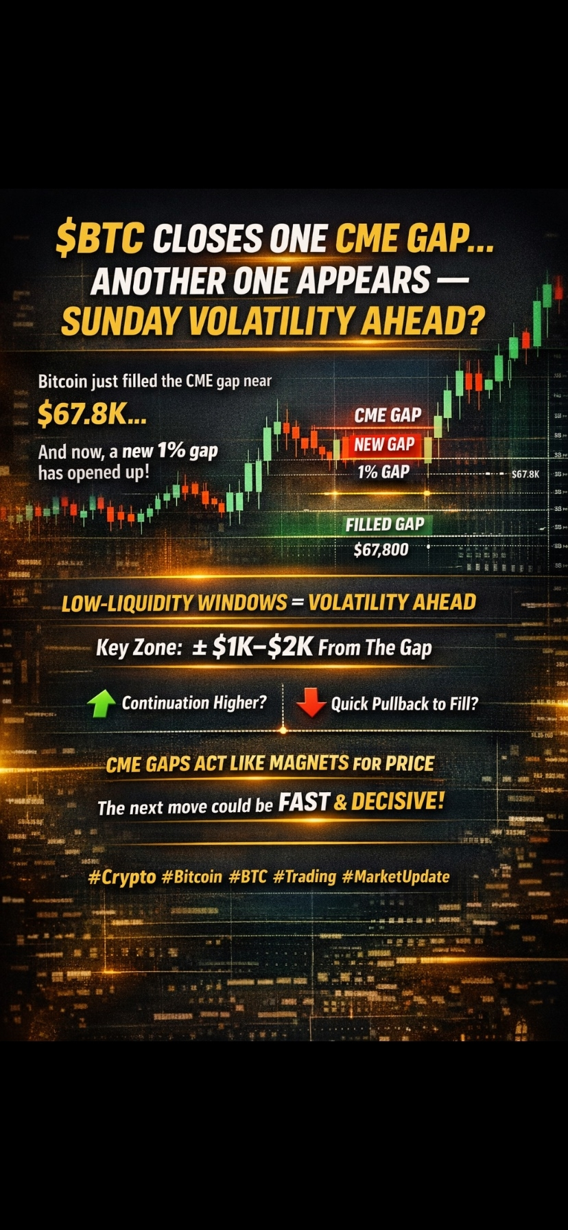 Bitcoin has just finished filling the CME gap near $67.8K, and as often happens, a new gap of around 1% has already opened up.