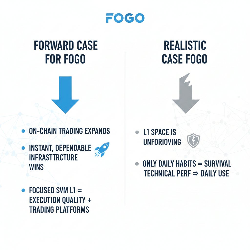 The forward case for Fogo is simple. If on-chain trading keeps expanding, infrastructure that feels instant and dependable will win attention. A focused SVM Layer-1 designed for execution quality could carve out a space, especially if real trading platforms anchor themselves there. The realistic case is also simple. The Layer-1 space is unforgiving. Only networks that turn technical performance into daily habits survive.
