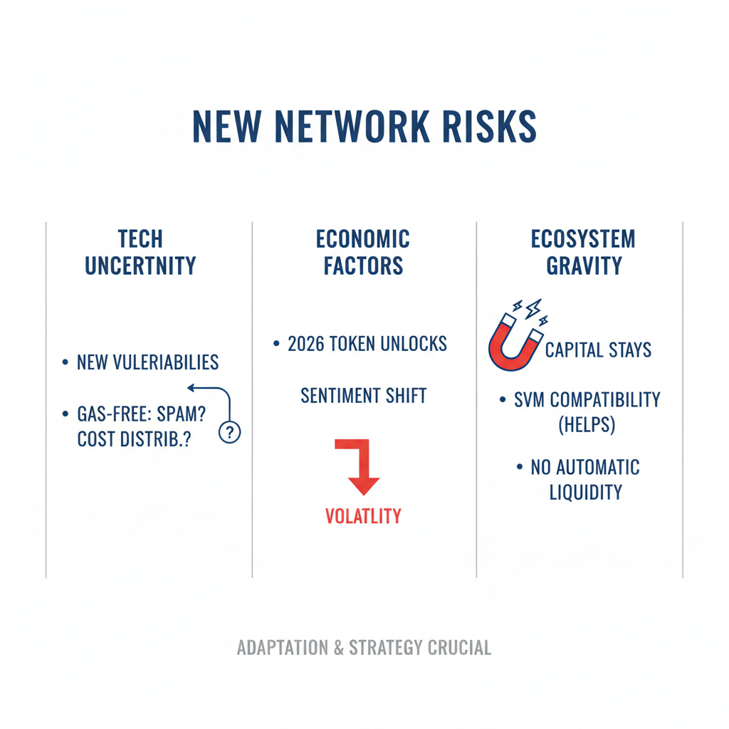There are other risks. It is a new network. New networks find new ways to break. Gas-free sessions improve user experience, but they also create questions around spam control and cost distribution. Token unlocks later in 2026 can shift sentiment quickly. And ecosystem gravity is real. Capital often stays where it already feels safe. SVM compatibility helps, but it does not automatically pull liquidity away from established chains.