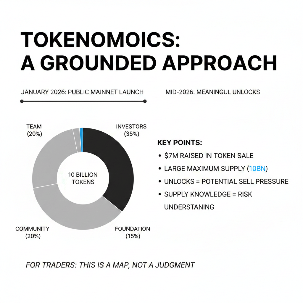On the token side, the story is more grounded than flashy. The project launched its public mainnet in mid-January 2026 after raising around $7 million in its token sale. Distribution reports show a large maximum supply, commonly referenced at 10 billion tokens, split across team, investors, community allocations, liquidity, and foundation buckets. Some meaningful unlocks are scheduled later in 2026. For traders, this is not a judgment. It is a map. Unlocks mean potential sell pressure. Timelines matter. Understanding supply is part of understanding risk.