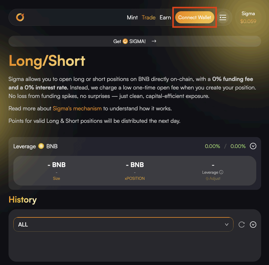 一键直达,连接 Web3 钱包 所有的交易操作都可以在 Sigma Money dApp 的 Trade 页面无缝完成。进入页面后,第一步只需点击右上角的 Connect Wallet,在弹出的钱包提示中确认授权,即可安全接入协议。
