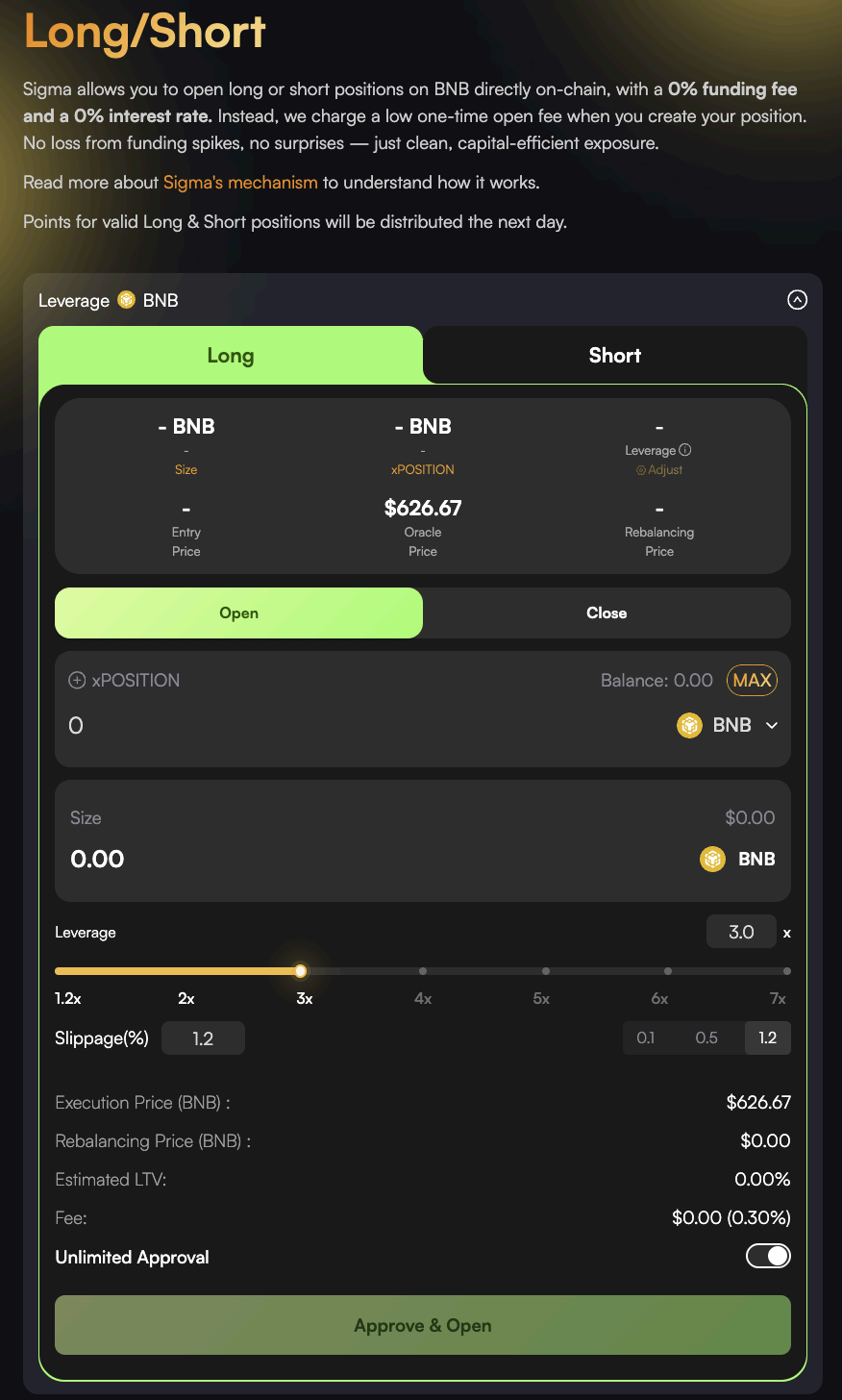 无论你是坚定看好 BNB 的持币人,还是预期市场回调想要做空获利,都可以直接通过 Sigma Money dApp 开立对应的 xPOSITION (多头仓位) 或 sPOSITION (空头仓位),精准实践你的交易策略。