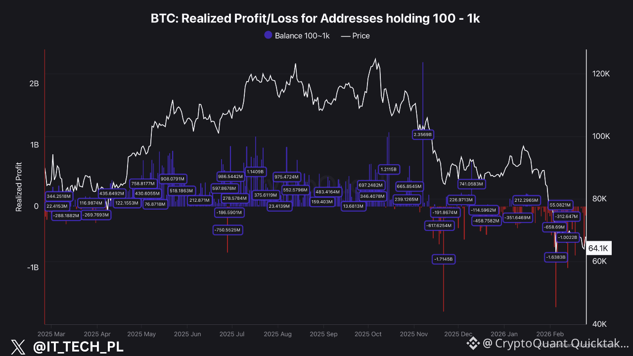 ⚠️ Mid-size whales are moving coins at a loss - and have been since Nov 2025.