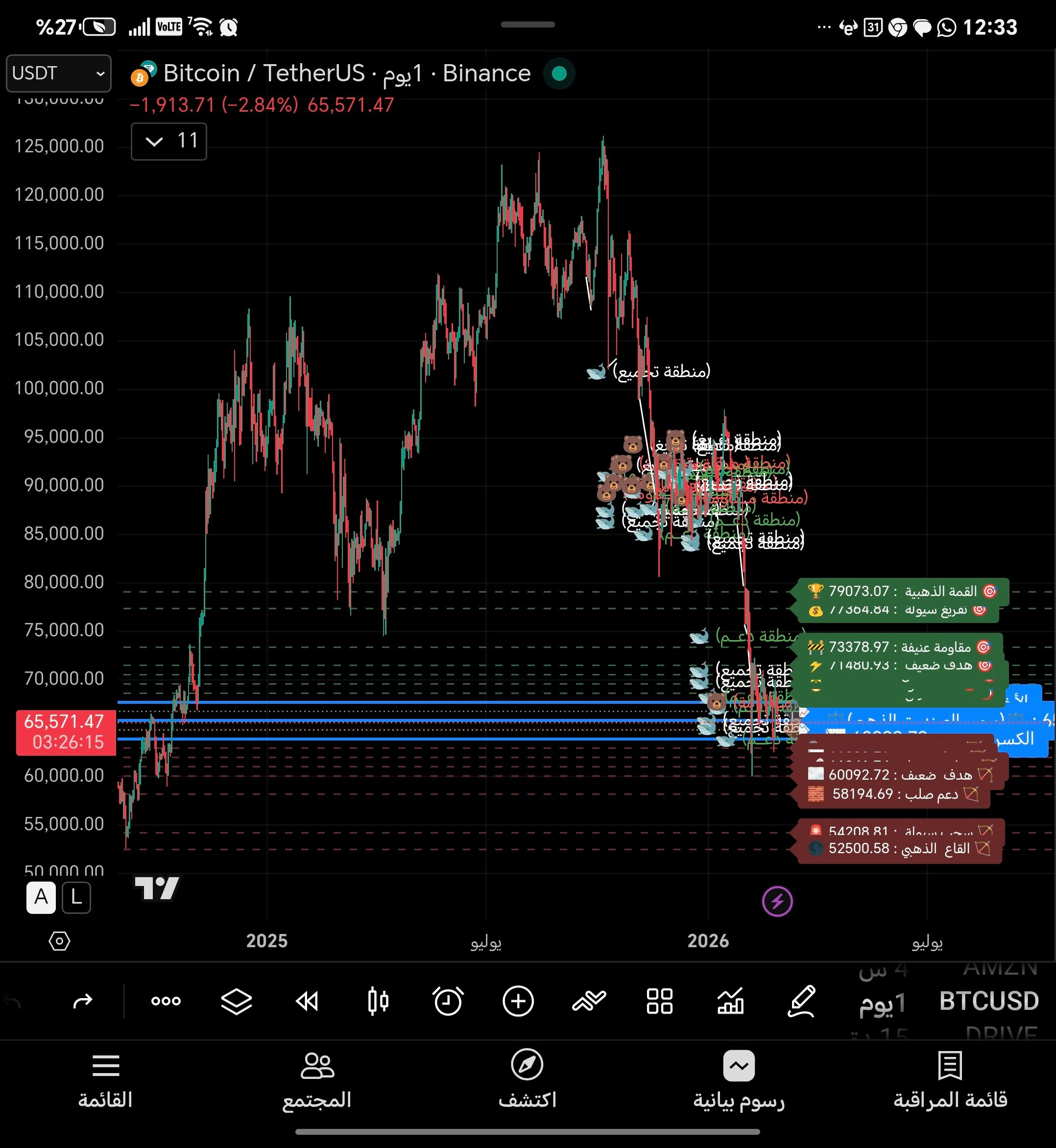 الدعم الأهم الآن بين 65,000 و65,500. هذه ليست أرقام عشوائية، بل مناطق تجميع حقيقية.