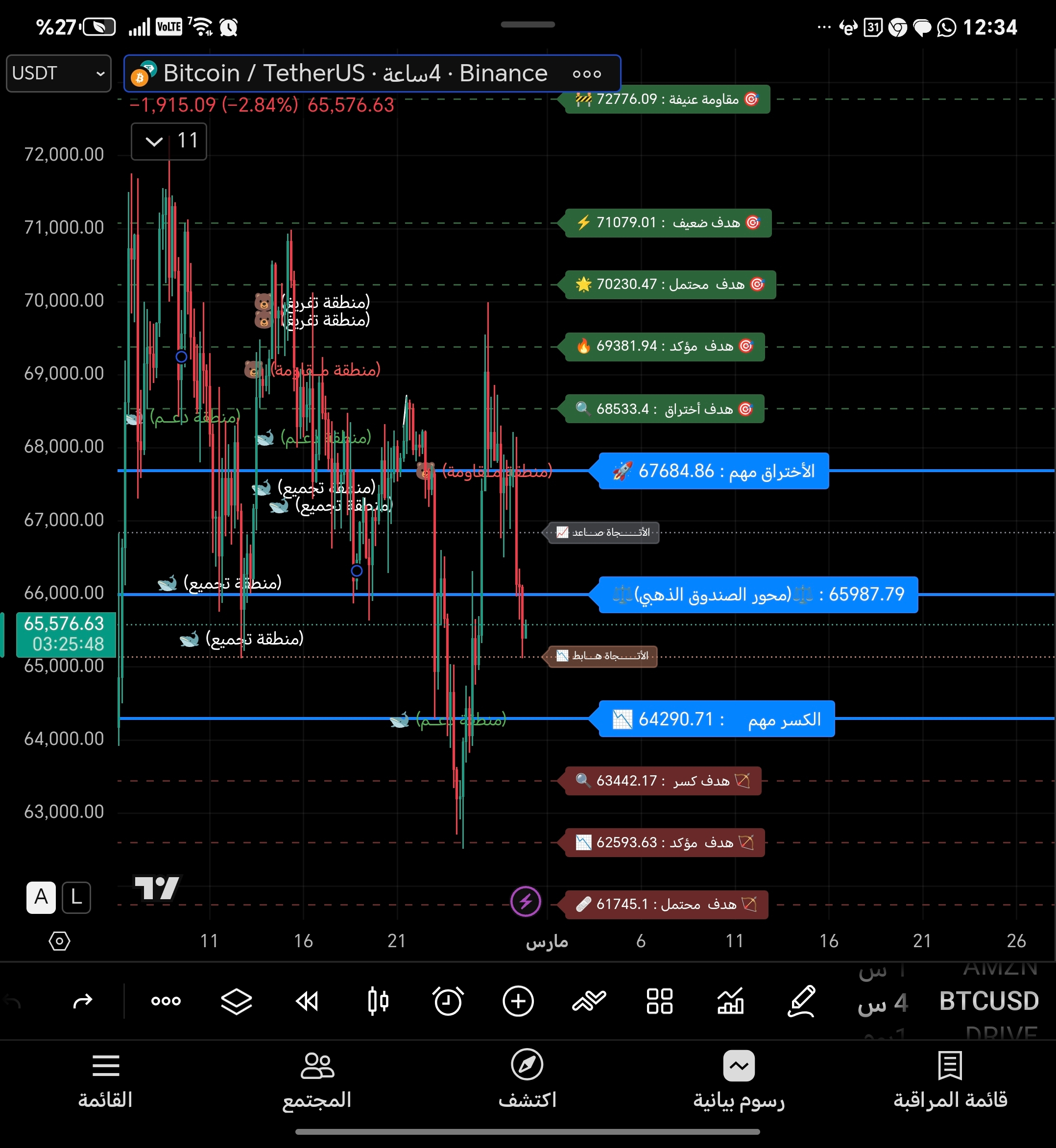 الدعوم التي سنراقبها وقتها: 64k → 62.5k → 60k → 58k.