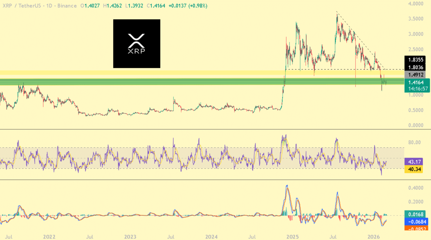 Thay vì phá vỡ xuống dưới, XRP đang dồn nén cho một nhịp di chuyển lớn. Nếu phe mua có thể giành lại dứt khoát mức kháng cự cục bộ $1.49–$1.50, nó sẽ mở khóa một động lượng tăng giá khổng lồ, dọn đường hướng tới mục tiêu vĩ mô $1.80.