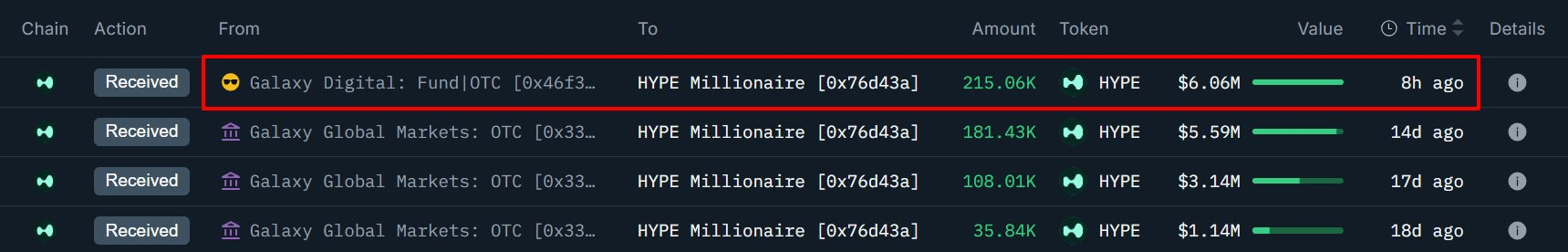 Các tổ chức đang âm thầm thâu tóm thị trường. Một cá voi khổng lồ vừa gom 215.056 HYPE 6.06 Triệu USD thông qua quầy OTC của Galaxy Digital. Ví này đã quyết liệt nâng quy mô nắm giữ lên 540.337 HYPE (14.86 Triệu USD) trong 18 ngày qua thông qua nhiều đợt mua.