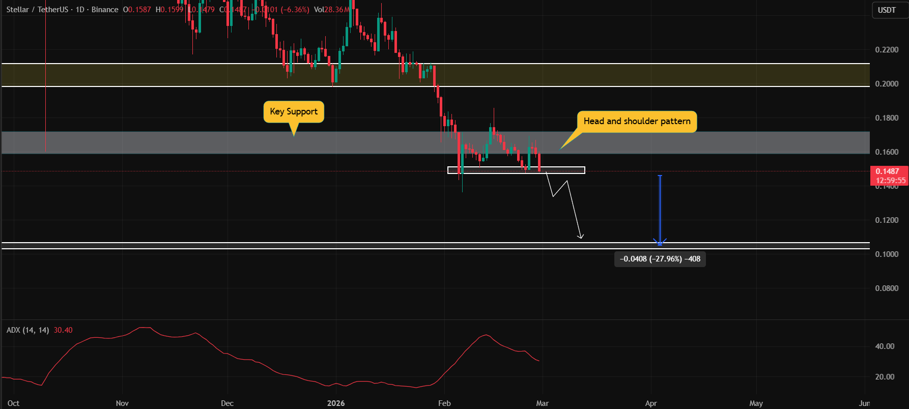 XLM đã vẽ ra một mô hình vai-đầu-vai giảm giá chuẩn sách giáo khoa sau khi đánh mất hỗ trợ quan trọng $0.158. Lằn ranh sinh tử tuyệt đối hiện tại là $0.145. Một cú đóng nến ngày dưới mức kích hoạt này sẽ xác nhận mô hình và mở ra cánh cửa sập cho một cú lao dốc tàn khốc 28% hướng tới mục tiêu $0.105.