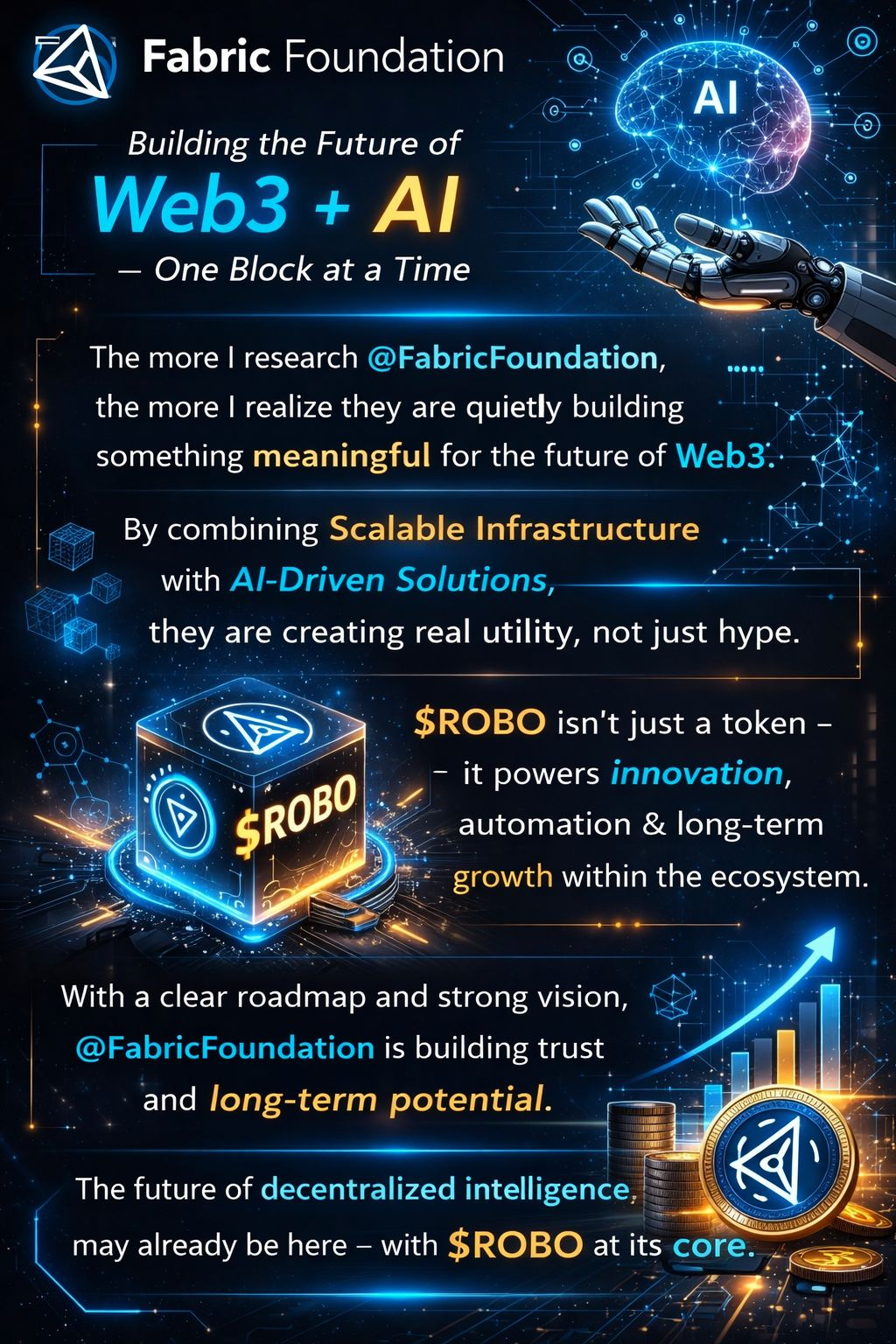 The more I research @Fabric Foundation the more I realize this project is quietly building something meaningful. While many crypto projects focus only on short-term hype, Fabric is taking a different route by developing scalable Web3 infrastructure that connects blockchain with AI-driven solutions. That combination alone makes $ROBO stand out in a crowded market.