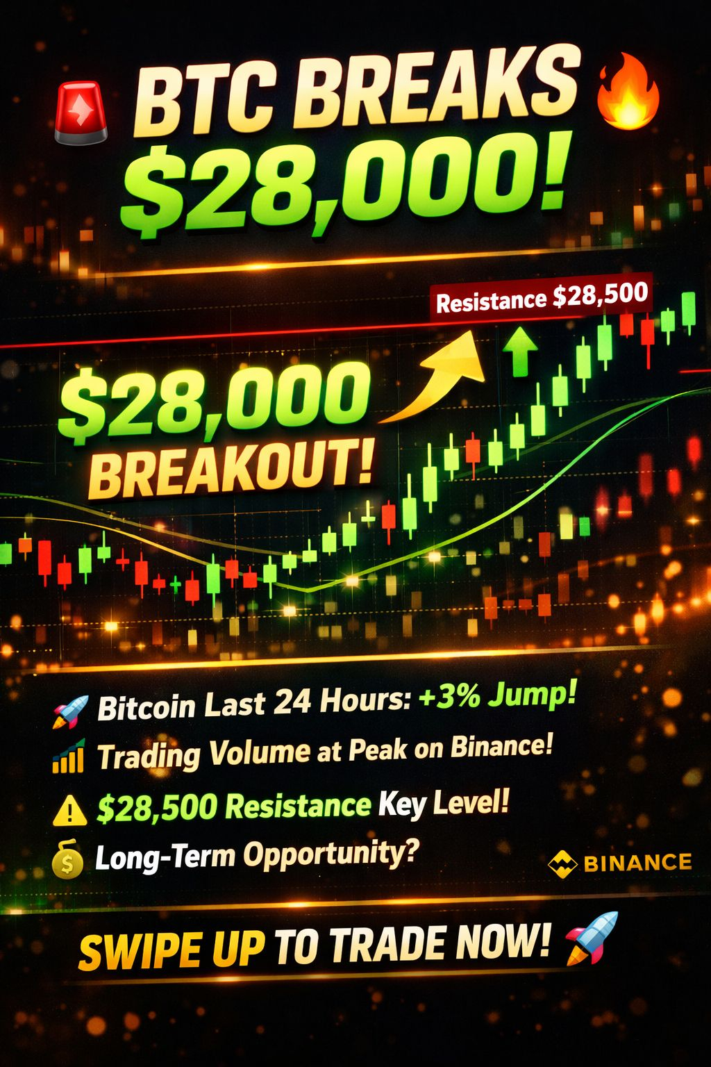 "🚨 $BTC właśnie przekroczył 28 000 USD! Czy pójdzie w górę, czy w dół następnie? 🔥📉 #CryptoAlert #Binance"