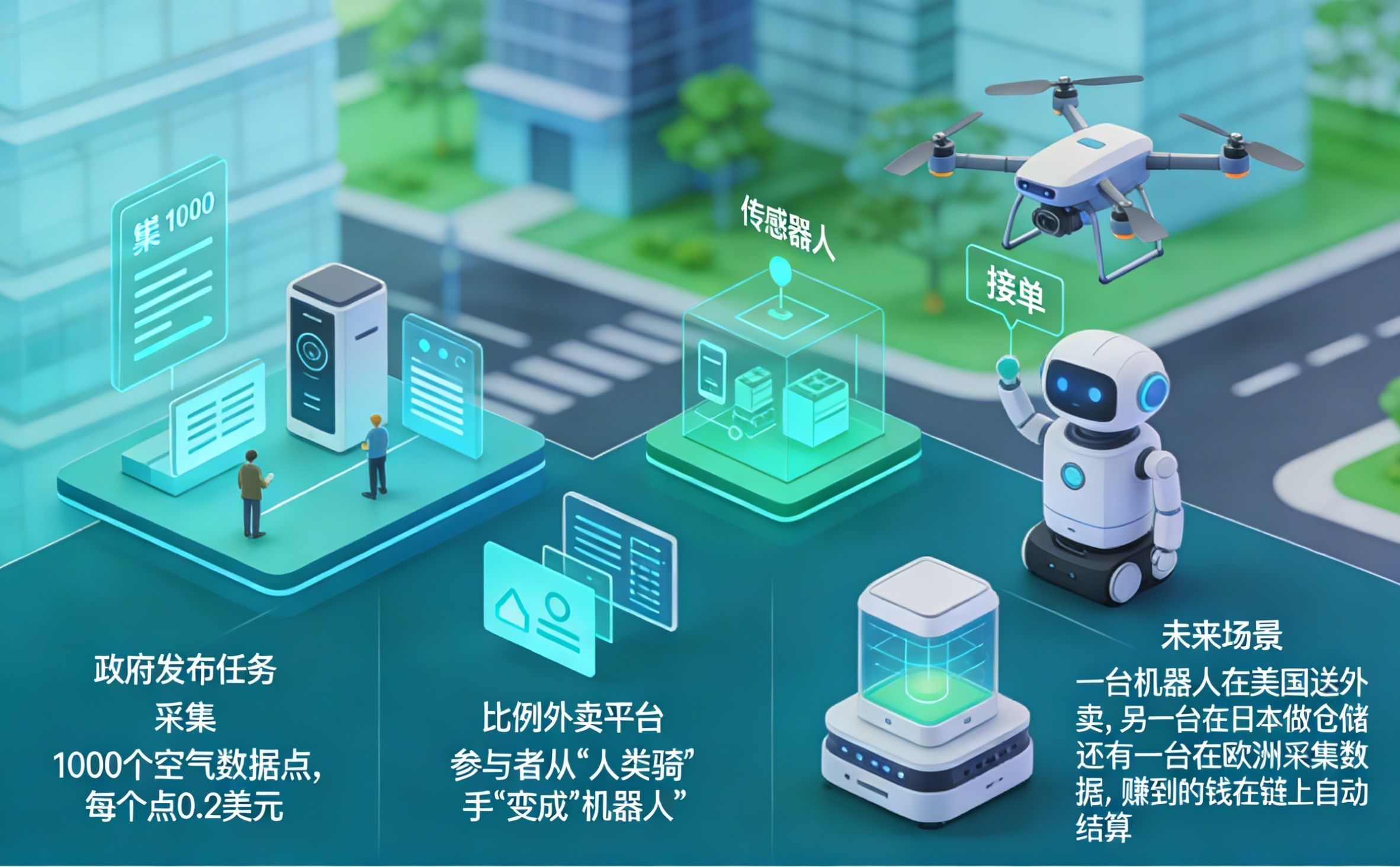 W związku z tym drony i roboty czujnikowe w mieście mogą przyjmować zlecenia. Kto wykona zadanie, ten dostaje nagrodę.