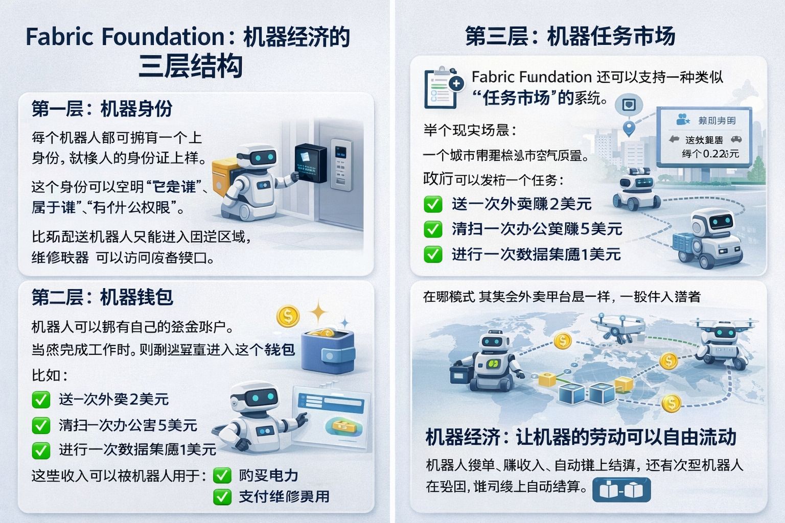 To tak, jakby każdemu robotowi dać "cyfrowy dowód osobisty" i "kartę bankową". To, co robi Fabric Foundation, można zrozumieć jako strukturę trójwarstwową.