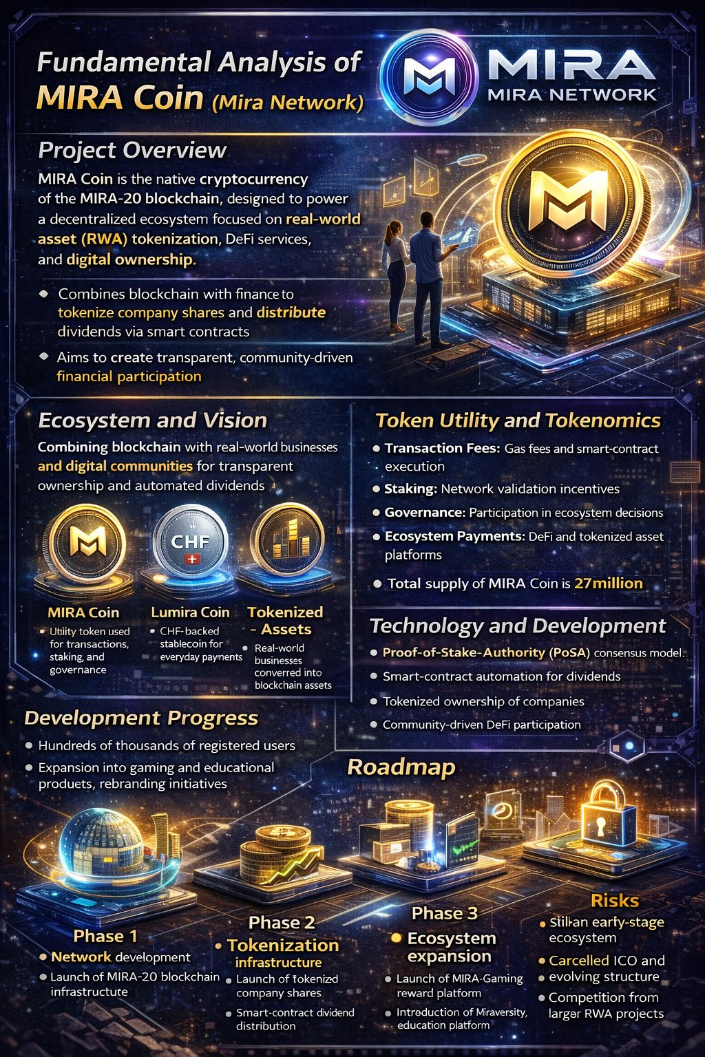 $MIRA Coin is the native cryptocurrency of the MIRA-20 blockchain, designed to power a decentralized ecosystem focused on real-world asset (RWA) tokenization, DeFi services, and digital ownership. The token acts as the core utility asset used for transactions, staking, and smart-contract execution within the network. �