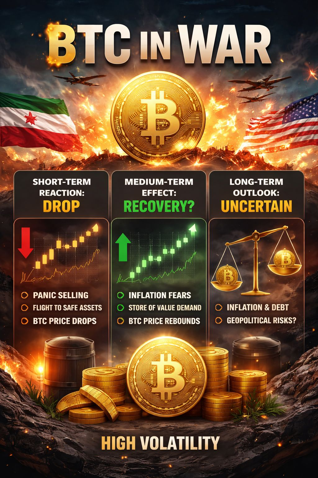 Short term: War news → crypto usually falls due to panic selling.