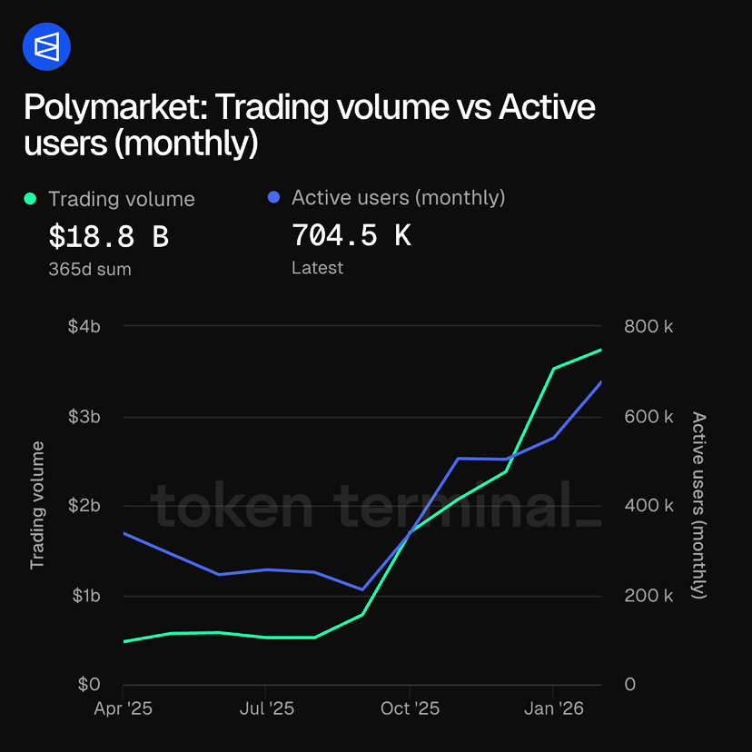根据 Token Terminal 在 2026 年 2 月的数据,Polymarket 的月活跃用户数创下了历史新高,达到了约 67.9 万人。