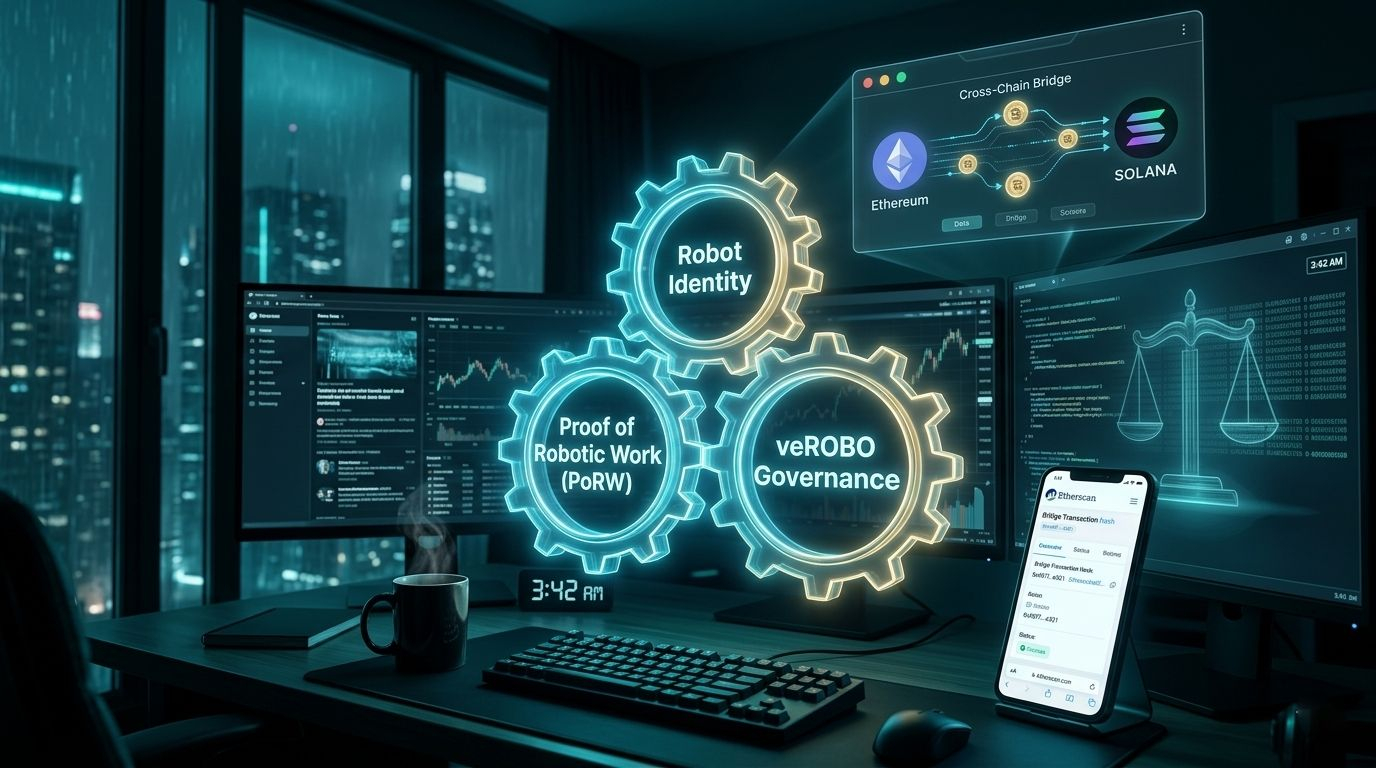 Three quiet gears turning here. First, the identity layer — every machine gets its own on-chain wallet and history. Second, Proof-of-Robotic-Work incentives rewarding actual contribution instead of just holding. Third, veROBO governance locks that let participants vote on fees, policies, upgrades. Together they create this silent flywheel. Robots earn, humans guide, the ledger records everything.