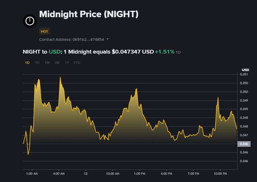 it's the revolutionary privacy layer that Web3 has desperately needed, now exploding onto the scene with massive momentum! Built as Cardano's premier partner chain, Midnight delivers rational privacy through cutting-edge zero-knowledge proofs (ZK-SNARKs), enabling programmable, selective disclosure. This means you can prove facts (like eligibility, ownership, or compliance) without ever exposing sensitive data—a game-changer for real-world adoption in finance, healthcare, identity, and beyond. No more forced binary choice between full transparency (like most chains) and total anonymity (like legacy privacy coins). Midnight restores crypto's original promise: true freedom with verifiable truth and sovereign control over your data.At the heart is the $NIGHT token...the unshielded, native governance and utility powerhouse (fixed supply of 24 billion). Holders govern the network, stake for rewards, and drive value accrual. Every NIGHT lance auto-generates DUST, the decaying, shielded resource that powers private transactions and smart contracts...ensuring predictable fees, active participation, and network efficiency without friction. This dual-token model (public NIGHT + private DUST) is genius engineering for sustainable, compliant privacy at scale.Now look at the charts...pure bullish fire! Just listed on Binance (March 11, 2026), $NIGHT/USDT exploded with +10%+ surge on massive volume (over $85M in recent sessions, spiking to hundreds of millions during pumps). Current price hovers around $0.0472, up +2.23% in 24h amid strong buyer absorption. The chart screams accumulation: