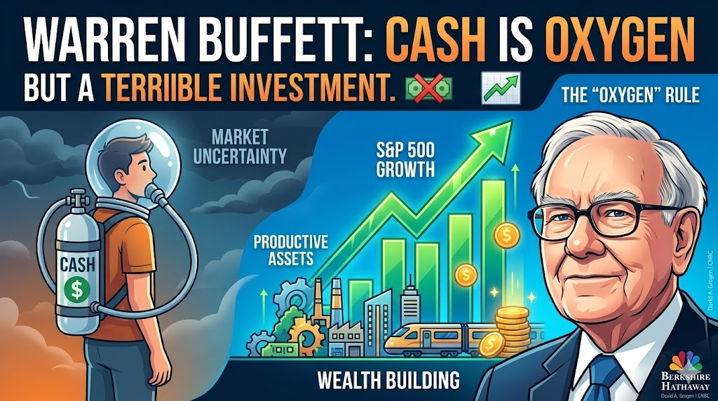 Buffett views cash as a baseline necessity—not a wealth builder.